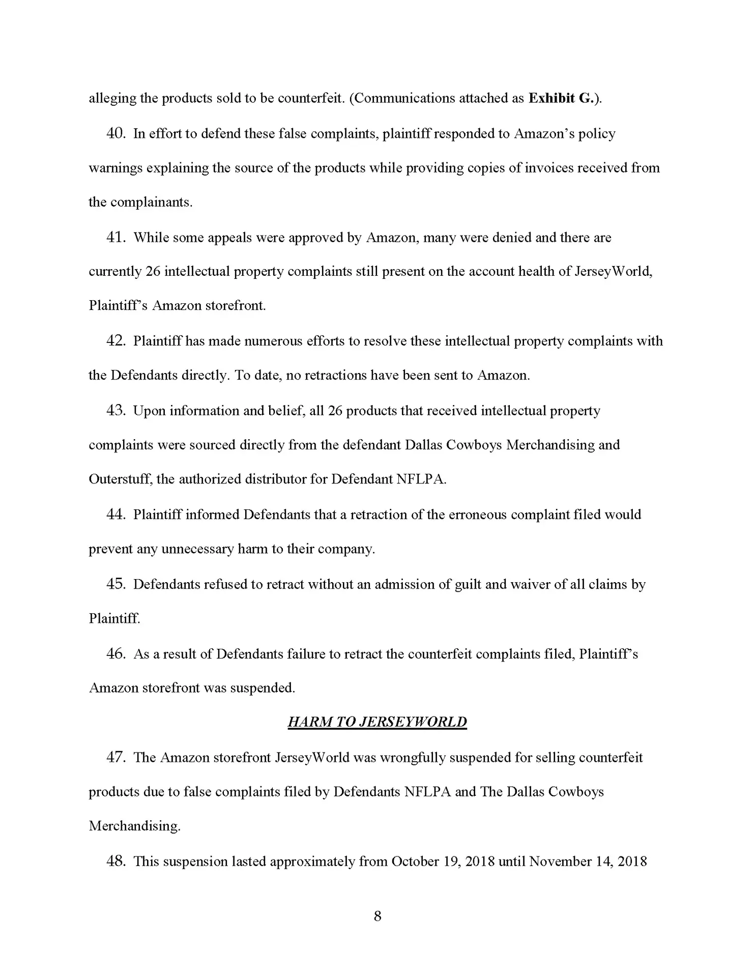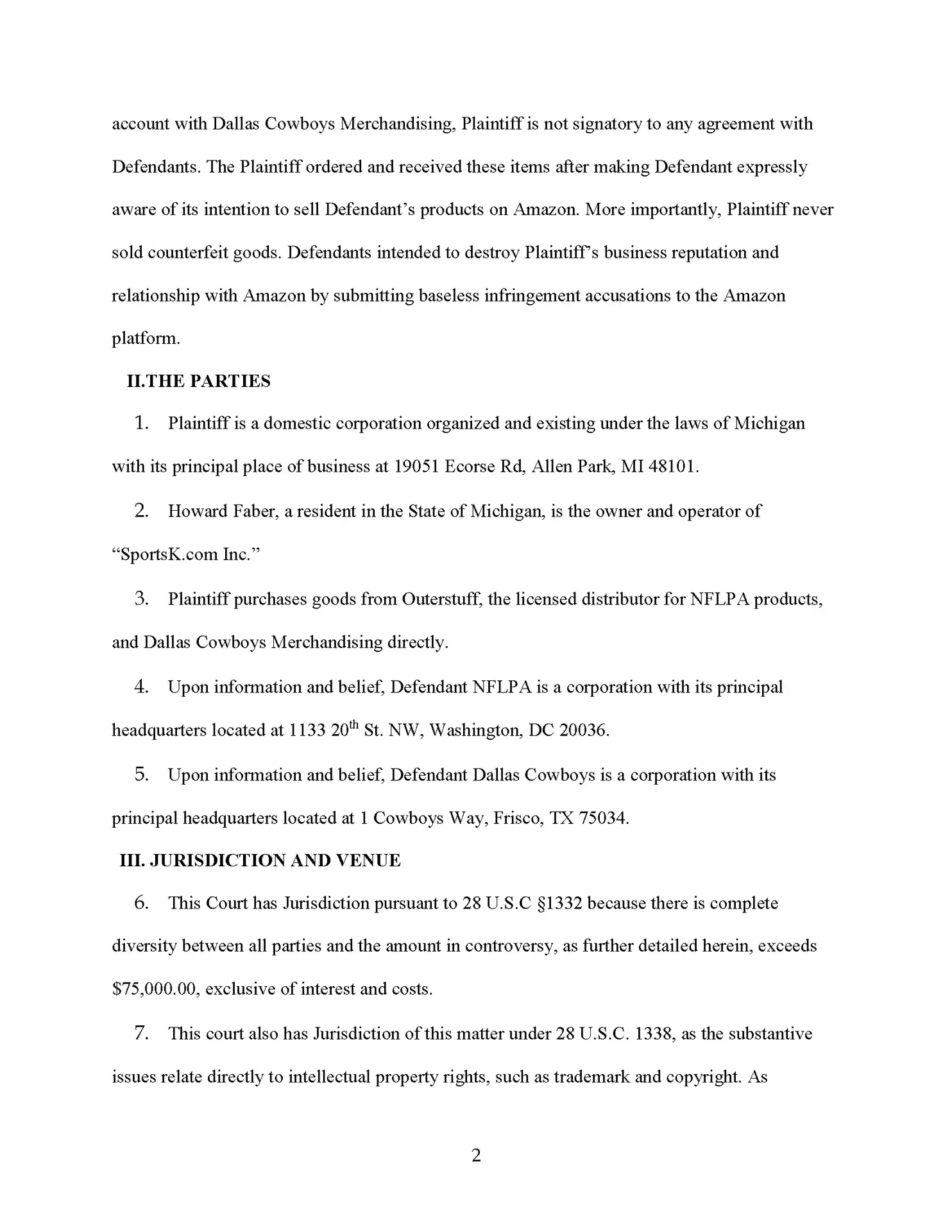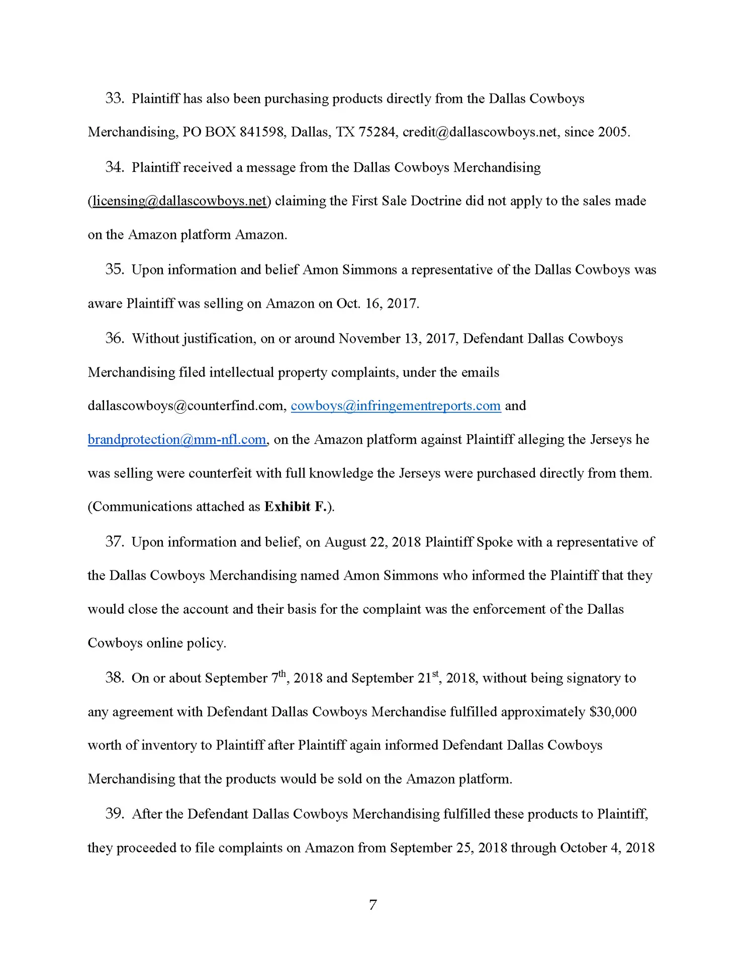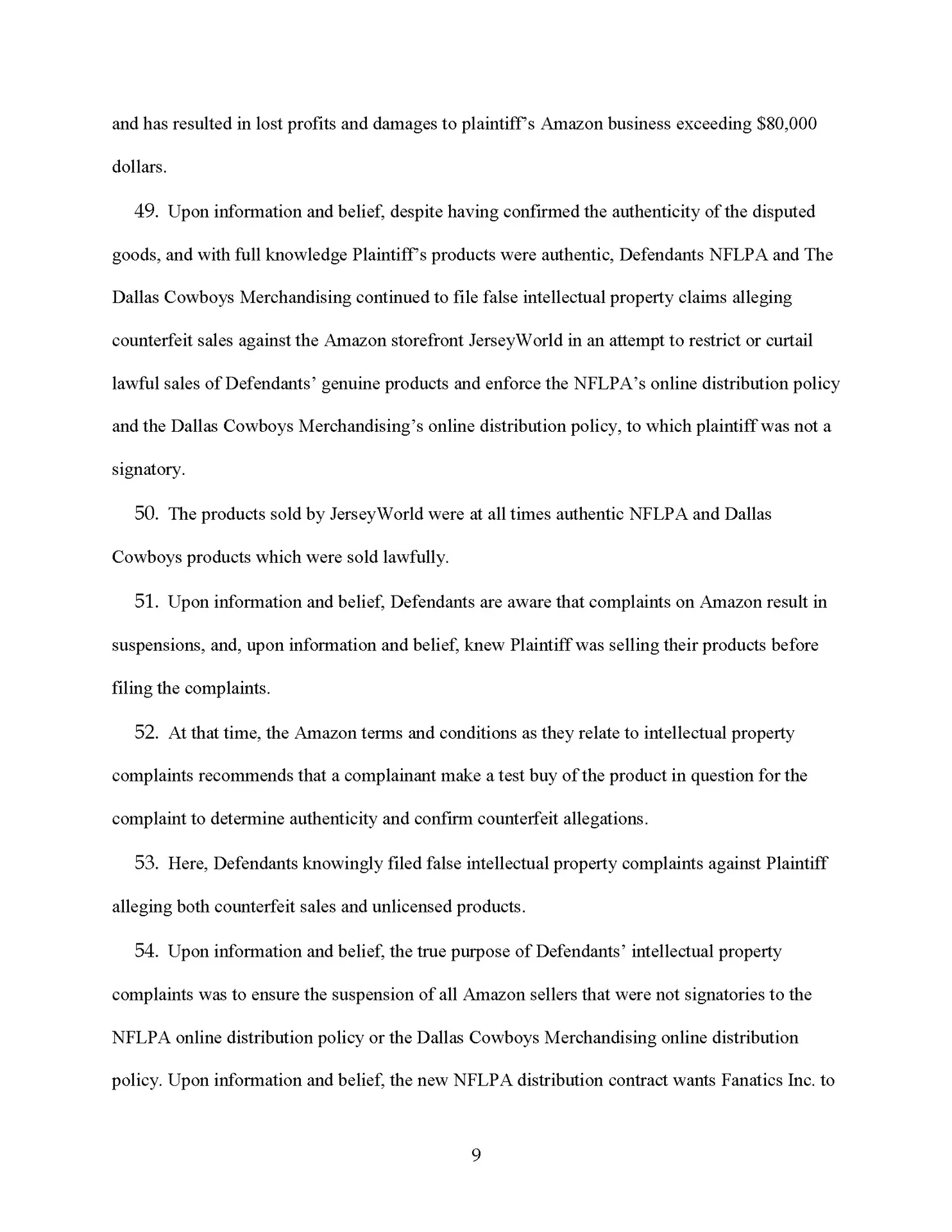 We are suing the Dallas Cowboys for making totally baseless complaints against one of our sellers who lost a boatload of money, and he’s not going to take it. So by the time you are seeing this news program, this law firm has sued the National Football League, the Dallas Cowboys, and the NFL players association for making 100% baseless IP complaints against one of our clients.