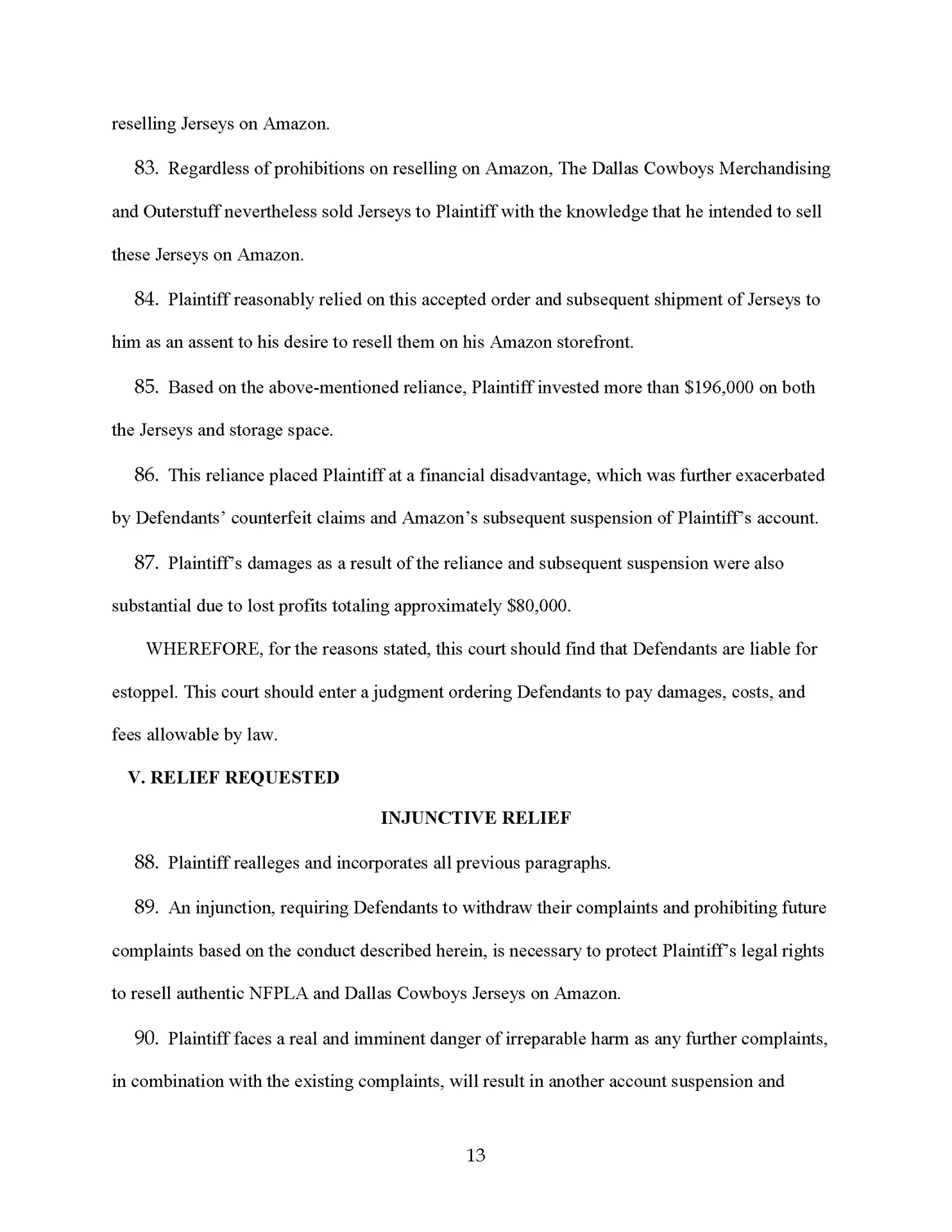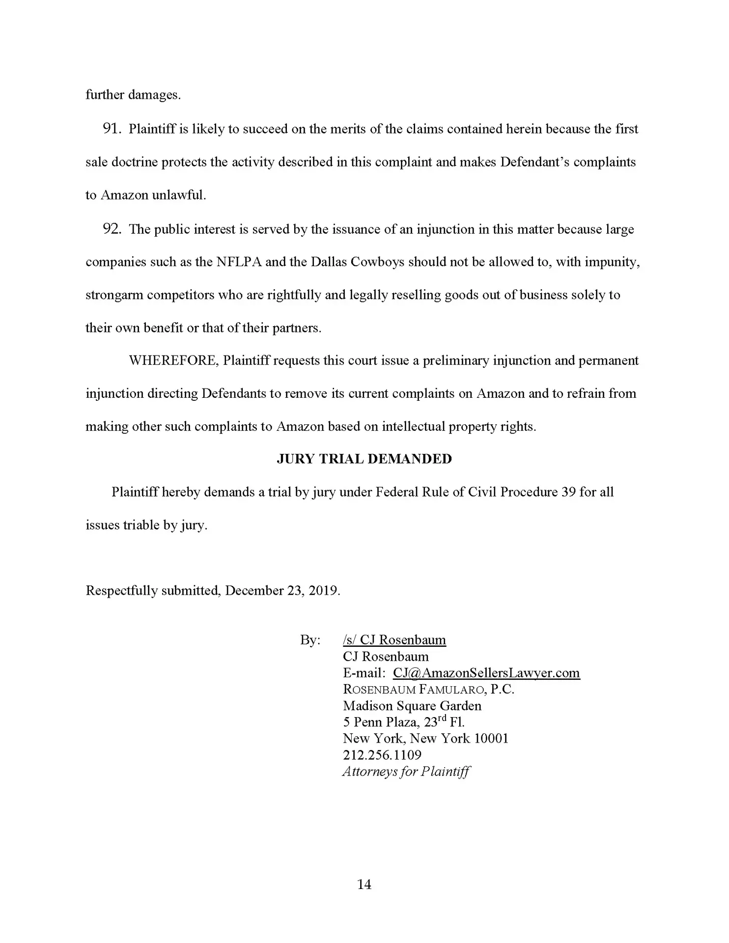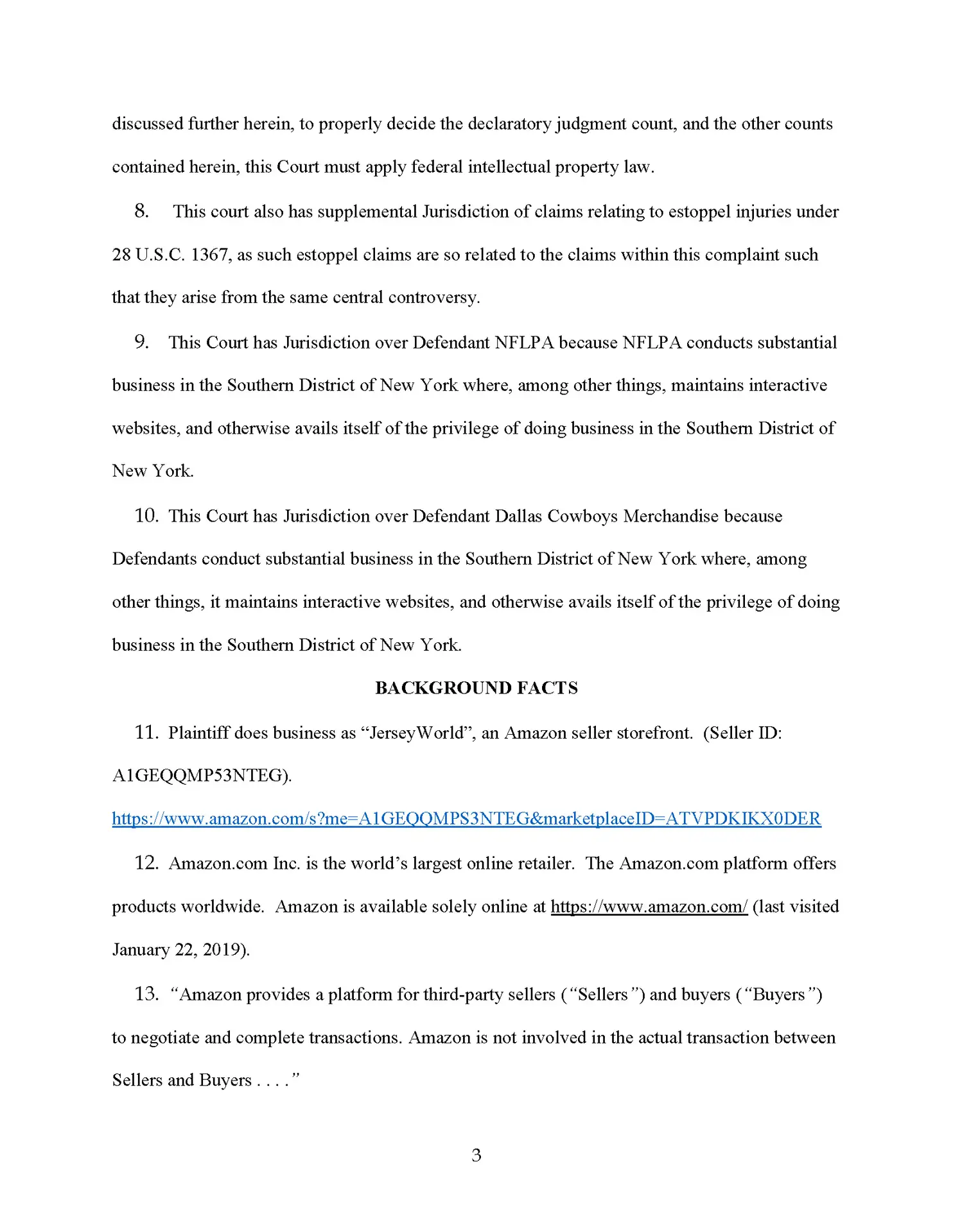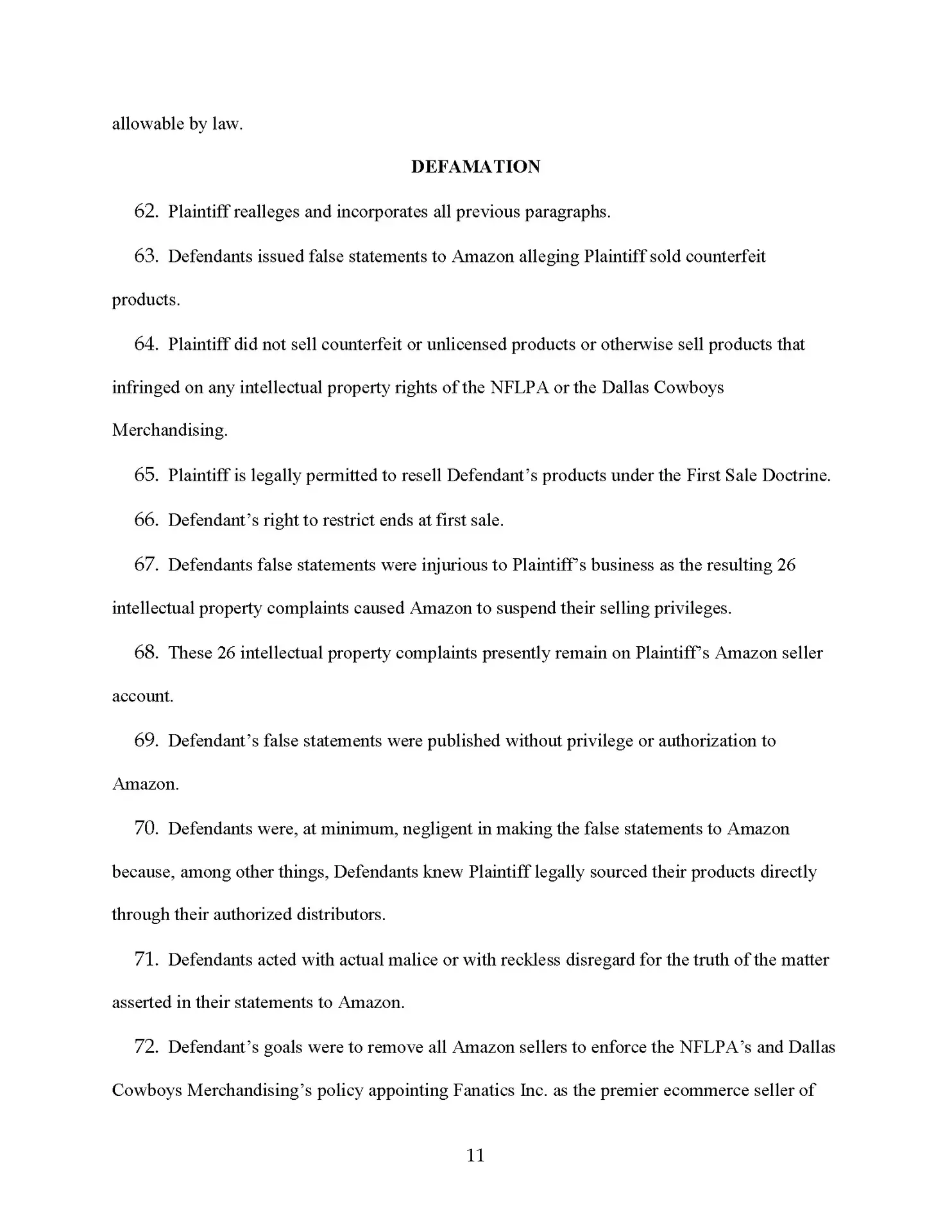 We are suing the Dallas Cowboys for making totally baseless complaints against one of our sellers who lost a boatload of money, and he’s not going to take it. So by the time you are seeing this news program, this law firm has sued the National Football League, the Dallas Cowboys, and the NFL players association for making 100% baseless IP complaints against one of our clients.